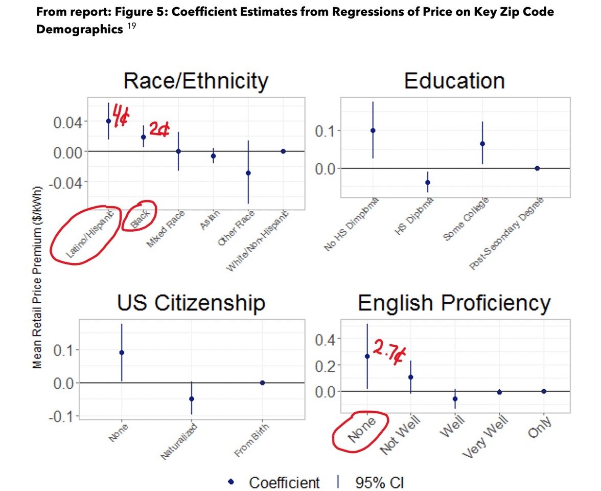 The report’s main finding is clear. From the report: “In contrast, I study firms’ decisions to actively market to consumers since direct marketing is responsible for most switching. I find evidence of structural discrimination: profit-driven marketing strategies interact with pre-existing residential segregation to disproportionately harm marginalized communities. [2] “I find that these pricing patterns hold more broadly across other states, time, data sources, and metrics of marginalized communities.” [3]